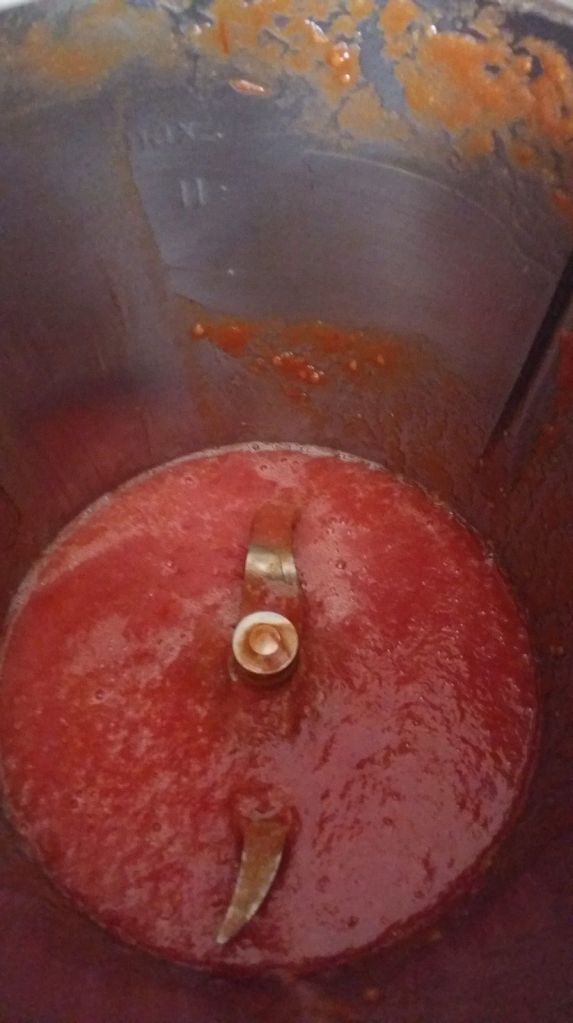 - Mettre les tomates rincées, la gousse d’ail et le miel dans le bol, mixer 30sec/Vit4, puis faire chauffer 15 min/100°C/Vit2,sans le gobelet.