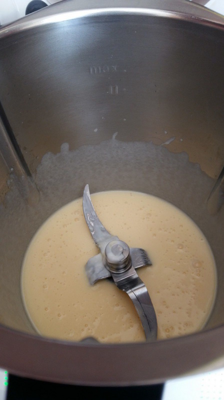 - Mettre le beurre dans le bol puis faire fondre 2min/90°C/Vit 2 ajouter le fromage blanc et les œufs puis mélanger 20sec/Vit3.