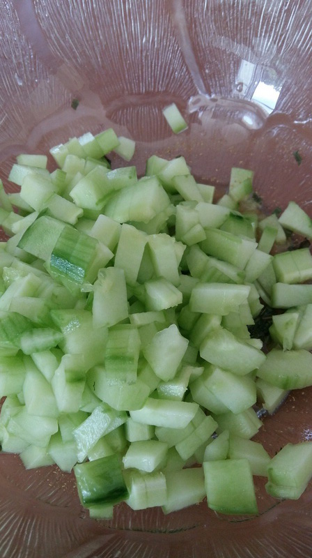 1. Éplucher le concombre et le couper en 2 dans le sens de la longueur, épépiner avec une petite cuillère et détailler la chair en dés.
