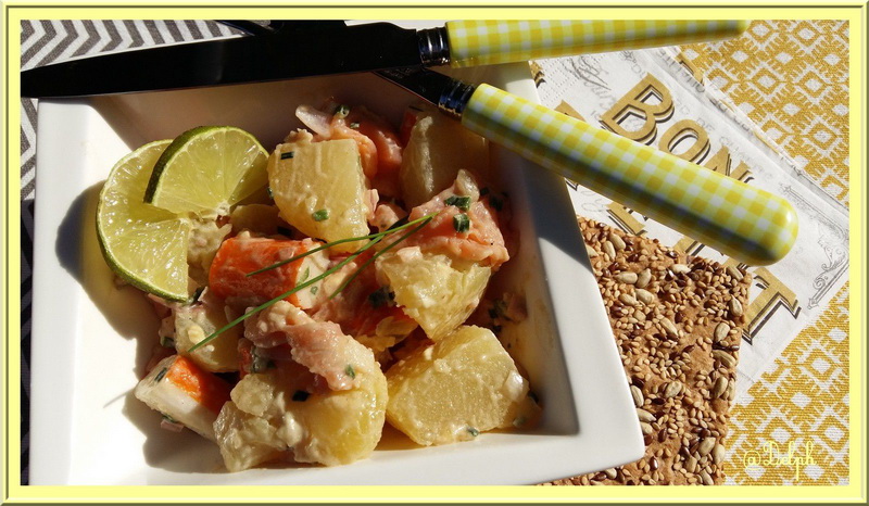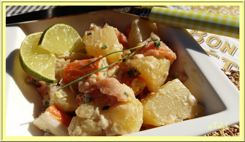 Je fais souvent salade de pommes de terre saumon. Le surimi nous en mangeons pas. C’est bien agréable comme petite salade. merci Delphine gros bisous