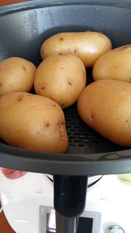 - Faire cuire les pommes de terre, mettre 500 g d’eau dans le bol du Thermomix avec