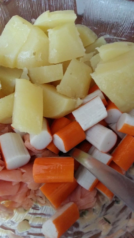 - Couper les pommes de terre en cube, les mélanger à la sauce, ajouter des lanières de saumon et les bâtonnets de surimi coupés en trois. Mélanger.