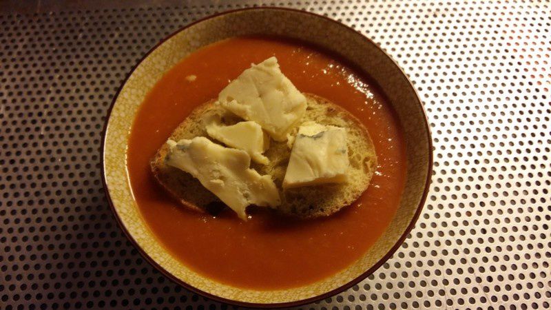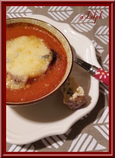 Je me suis bien régalée avec cette soupe, j’ai utilisé la fourme de ma copine Zabou, pour Noël elle m’a bien gâtée en m’envoyant un beau colis avec du fromage et des livres de recettes. J’ai utilisé de la purée de tomates car en ce moment les tomates n’ont aucun goût