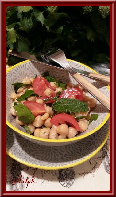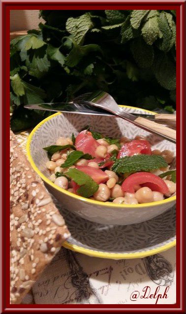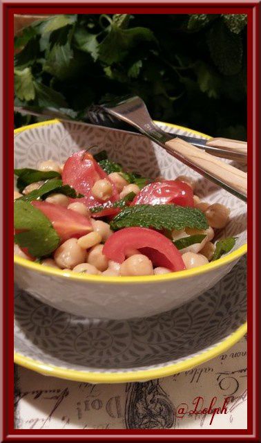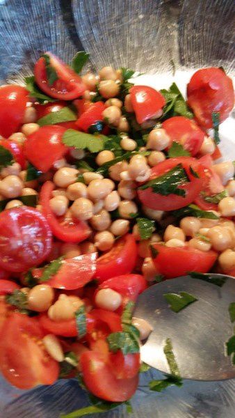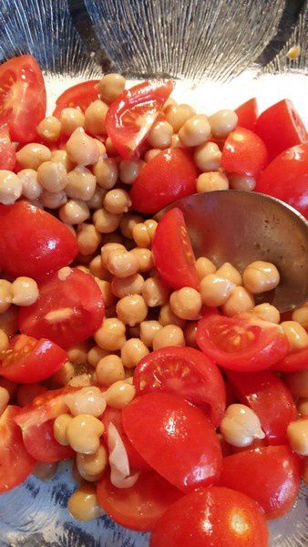 - Dans un saladier mélanger le jus de citron avec les épices, un bonne pincée de sel et 6 à 8 c à s d’huile d’olive. Laver et couper les tomates en dés et les ajouter au saladier. Ajouter les pois chiches et mélanger.