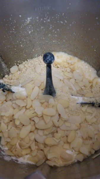 - A la sonnerie, ajouter la farine, la poudre d’amande, le sel et la levure chimique, les 30 g d’amandes effilées puis mélanger 40sec/Vit3.