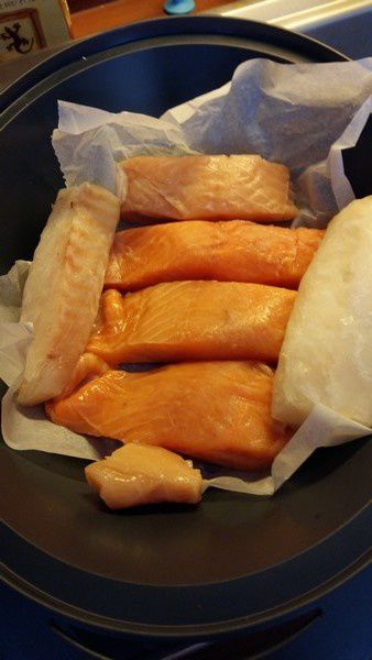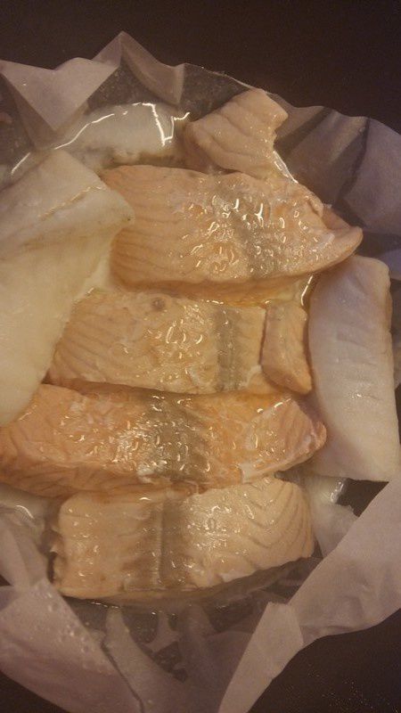 - Pendant ce temps, froisser puis mouiller une feuille de papier cuisson, et l’aplatir dans votre panier Varoma, placer votre saumon et le cabillaud.