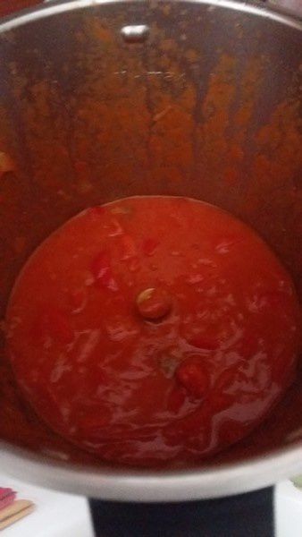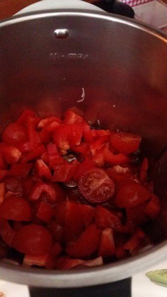 - Ajouter, dans le bol (sur l’ail et l’oignon), le poivron coupé en morceaux, les tomates concassées, le vin blanc , le sel et le poivre, mettre en place le panier Varoma puis programmer 25min/Varoma/couteau inversé/mijotage.