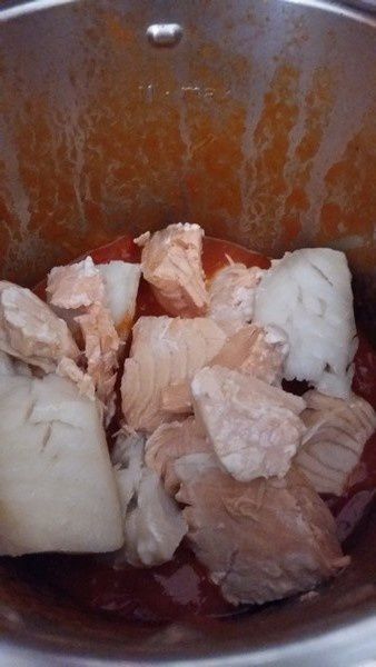 - A la sonnerie, j’ai coupé mon poisson en gros cubes puis je l’ai mis sur le sauce pour qu’il s’imprègne du goût, j’ai donné un léger coupe de spatule.