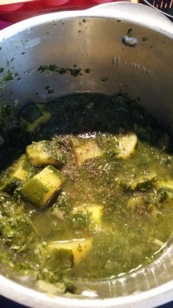 - Éplucher et couper votre oignon en deux, le mettre dans le bol et mixer 5sec/Vit5, laver et éplucher vos courgettes, les couper en rondelles et les ajouter à l’oignon, mettre également vos épinards, votre bouillon cube et votre eau puis programmer 18min/Varoma/Vit mijotage.