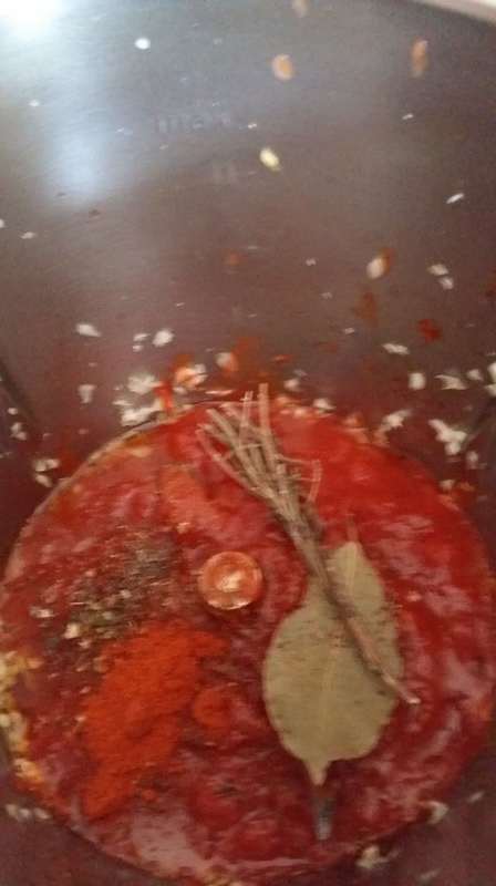 - Éplucher vos gousses d’ail les émincer, puis les faire revenir avec un peu d’huile d’olive, ajouter la pulpe de tomate, le romarin, le thym, le paprika, l’origan, le piment d’Espelette et la feuille de laurier, assaisonner, puis faire revenir une dizaine de minutes sur feu doux.