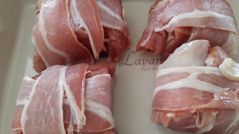 - Pendant ce temps, couper votre filet mignon en morceaux de 5 cm environ. Barder vos morceaux de 2 tranches de lard. Mettre le reste des tranches de lard au fond de votre plat.