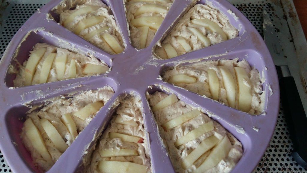 - Couper la deuxième pomme en petits morceaux et enfoncez-les dans la pâte.