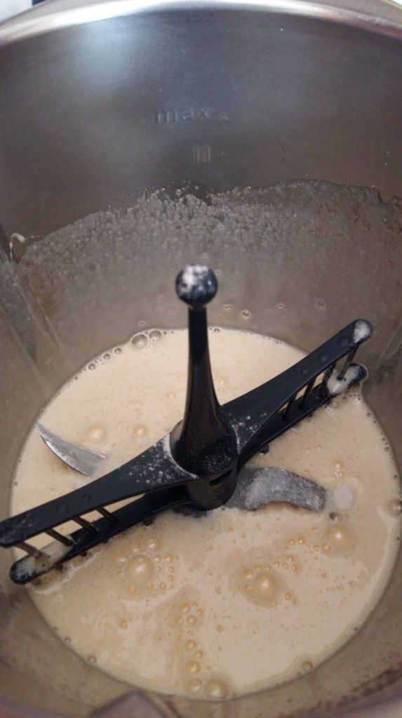 2. Insérer le fouet, (j’ai laissé le fouet toute la préparation), puis mettre les œufs et le sucre dans le bol, fouetter 1min/Vit3 avec la fouet.