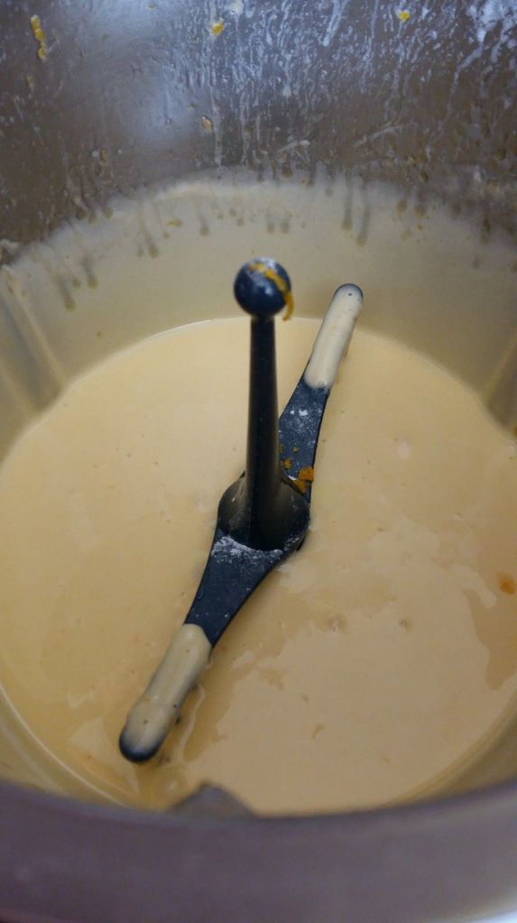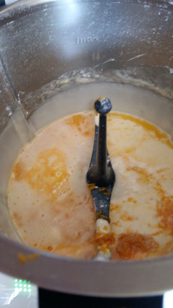 4. Pendant ce temps, faire fondre le beurre. Incorporez-le au mélange, avec la zeste de l’orange et son jus puis fouetter 40sec/Vit3.