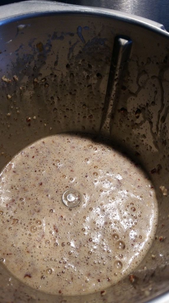 - Séparer en deux les noix de pécan en gardant les plus belles d’un côté ( pour le dessus de la tarte) et prendre les autres pour les ajouter dans le bol, verser le beurre fondu dessus puis mélanger 20sec/vit4.