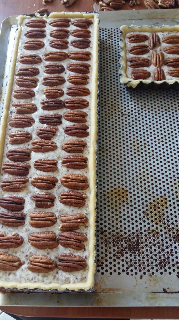 - Verser le mélange aux noix hachées dans le moule où se trouve la pâte sablée.
