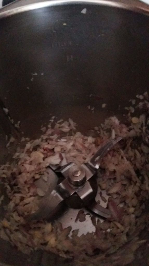 - Éplucher vos échalotes, puis les poser dans le bol avec la gousse d’ail épluchée et dégermée mixer 3sec/Vit5.