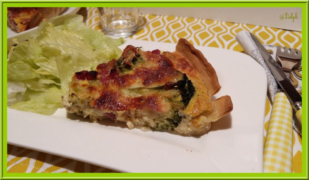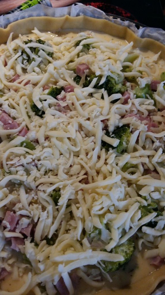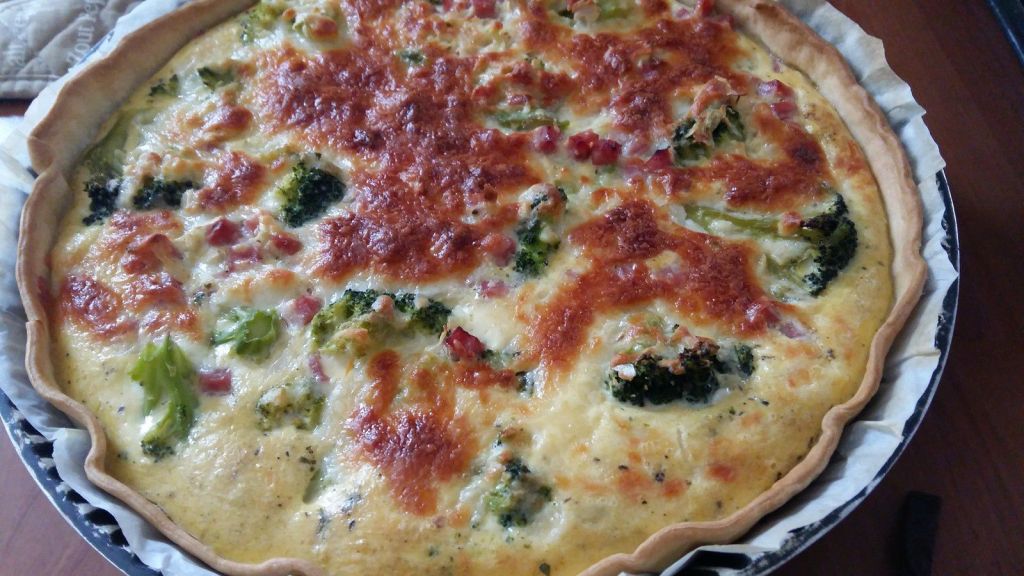 - Déposer votre pâte dans un moule, piquer le fond à l’aide d’une fourchette, disposer les têtes de brocolis, et les dés de jambon, puis mettre par dessus l’appareil.