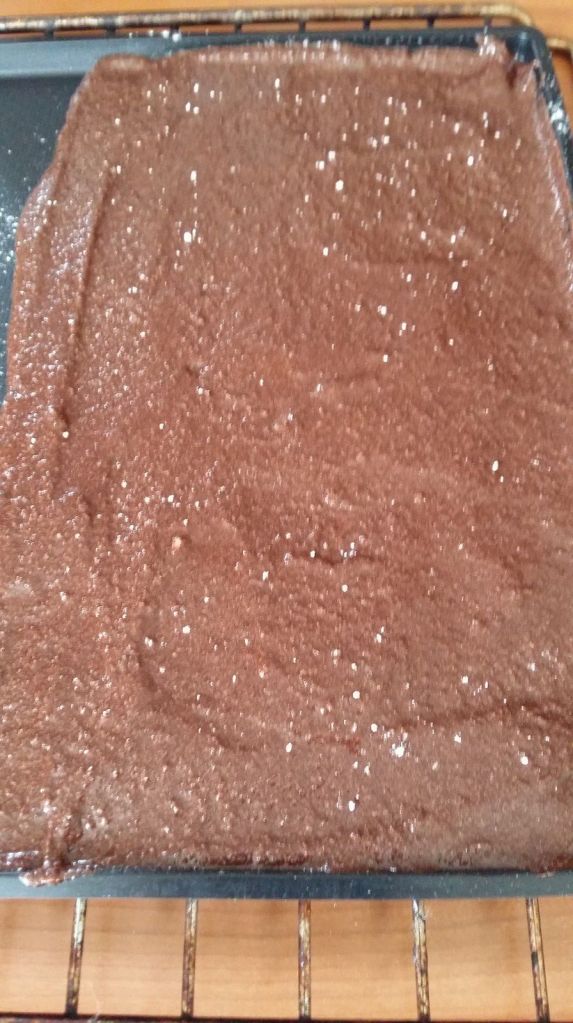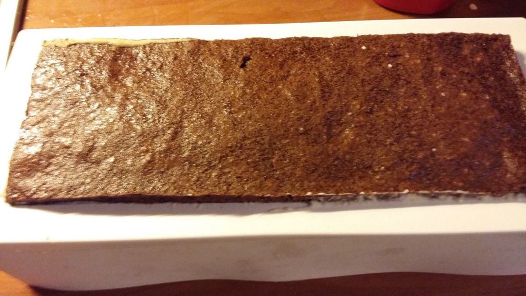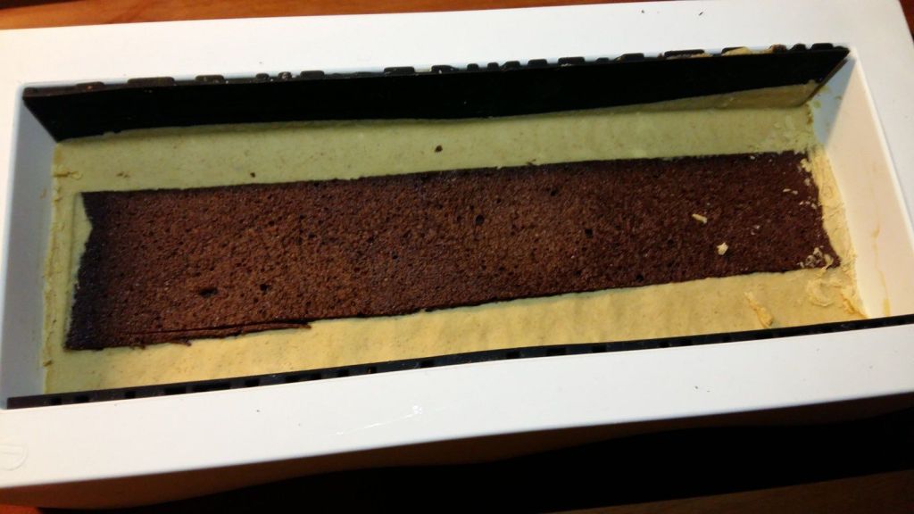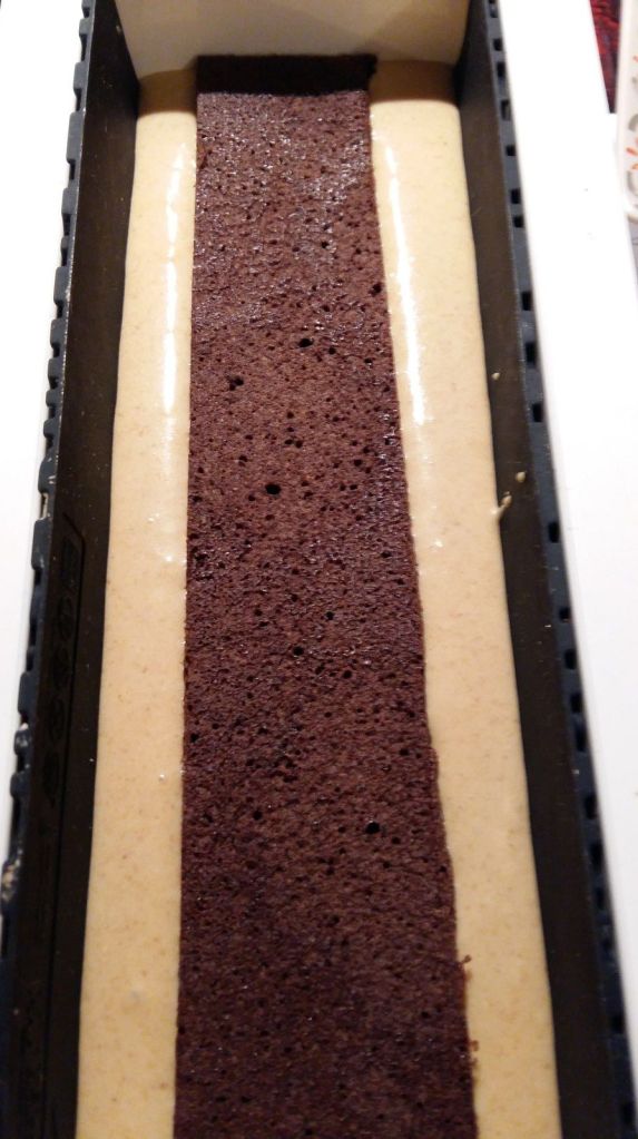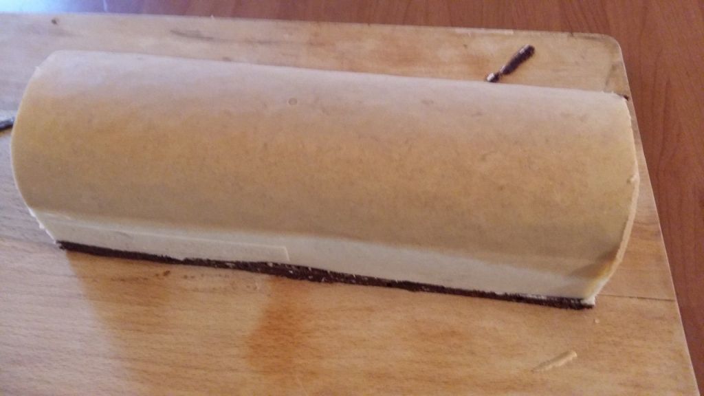 - démouler à froid et détailler une bande de la longueur de votre moule à bûche et une bande plus petite de 5 cm et toujours la longueur de votre moule à bûche.