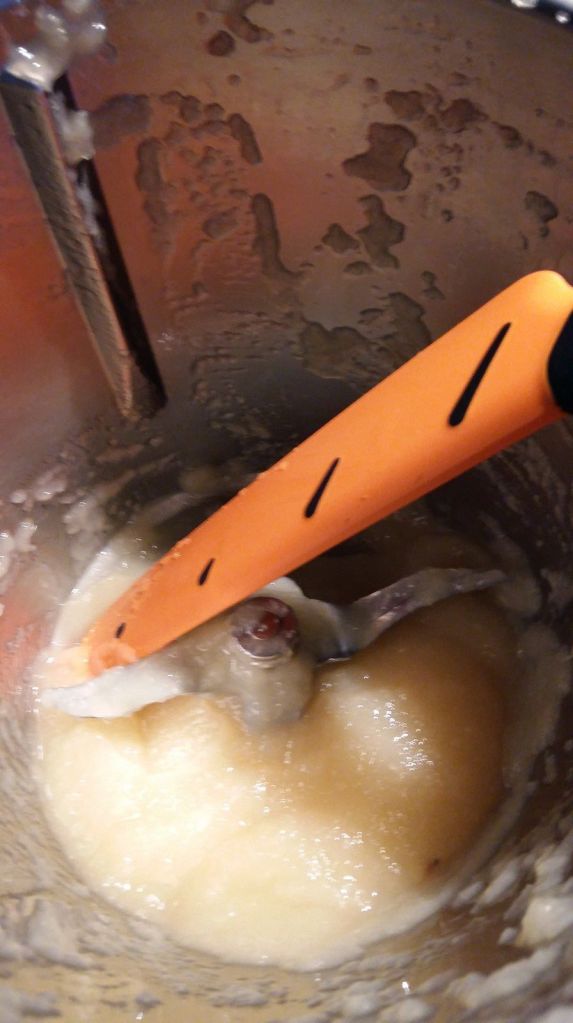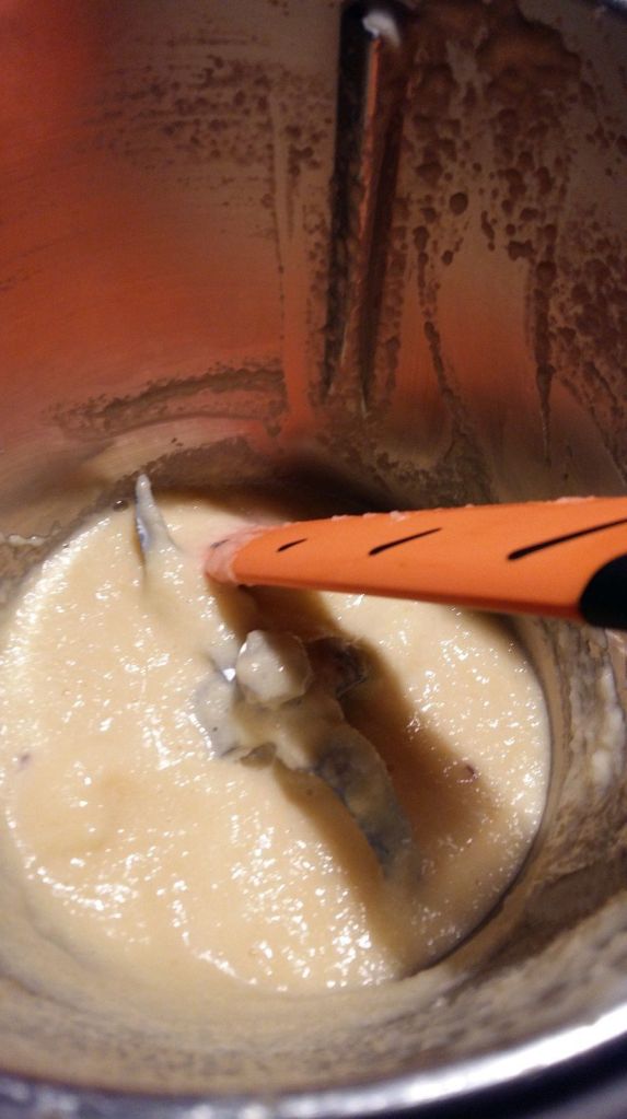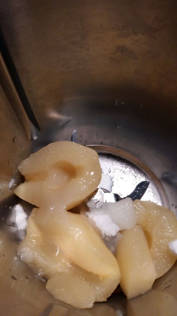 Je n’avais pas de purée de poires je l’ai donc réalisée. J’ai pris des poires au sirop.Pour la purée de poires, mettre 200 g poires dans le bol du Thermomix avec une cuillère à café de jus de de citron et 20g de sucre mixer 1min/Vit5. Réserver.