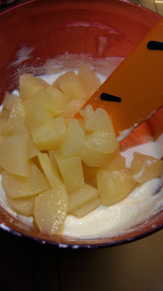 - Monter la crème fraîche en crème fouettée et l’incorporer au mélange précédent, j’utilise toujours mon speedy chef. Ajouter les dés de poires.