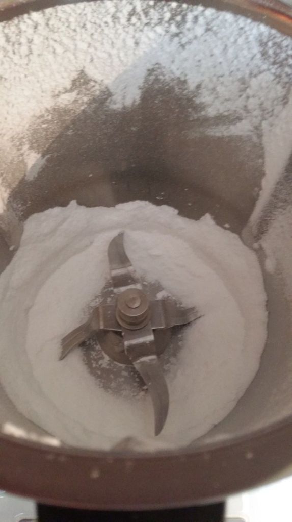 - J’ai préparé mon sucre glace j’ai mis 90 g de sucre en poudre et j’ai mixé 10sec/vi9. J’ai retiré 10 g pour la fin;