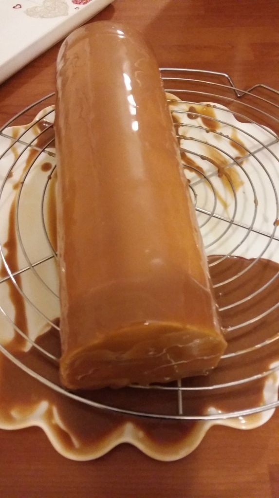 - Démouler la bûche, la poser sur une grille, napper le dessus avec le glaçage à 40°C.