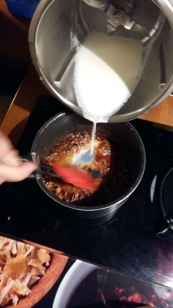 - Mettre le lait dans le bol du Thermomix puis faire chauffer 3 min/100°C/Vit1, pendant ce temps, verser l’eau et le sucre dans une casserole et réaliser un caramel foncé, tourner la casserole sur elle même régulièrement, lorsque votre caramel est réalisé faire décuire le caramel en versant le lait chaud (du Thermomix) petit à petit par-dessus, attention ne pas tout mettre d’un coup si non il y a risque de brûlure. Cela peut gicler, bien mélanger avec une maryse..