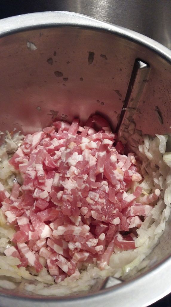 - Peler et émincer les oignons, les faire revenir 8 à 10 minutes avec les lardons et la brindille de thym et le laurier.