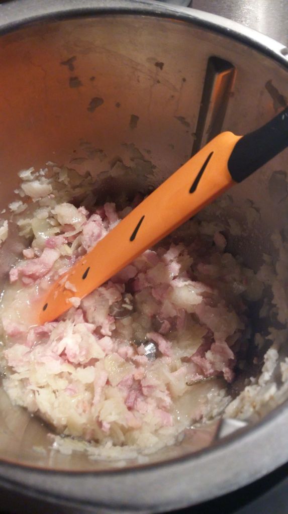 - Peler et couper en 2 les oignons, les mettre dans le bol et mixer 5sec/Vit5, ajouter les lardons, la feuille de laurier, le thym puis faire chauffer 9min/95°C/couteau inversé/Vit mijotage.