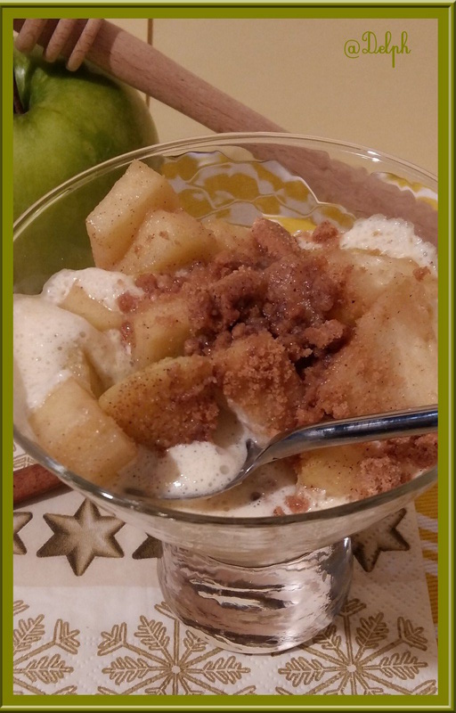 - Émietter grossièrement les spéculoos (pas en poudre, mais en petits morceaux) et les imbiber du jus de cuisson des pommes, garder un peu de jus de cuisson pour la décoration finale..