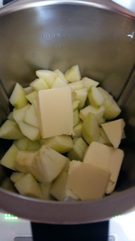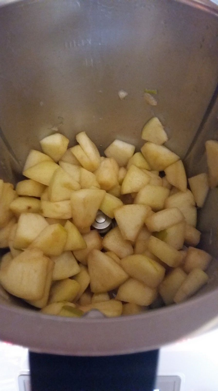 - Éplucher les pommes et les couper en petits dés, les mettre dans le bol avec le beurre coupé en petits dés, faire chauffer 3min/90°C/couteau inversé/Vit mijotage. A la sonnerie, ajouter le miel, le sucre vanillé et une cuillère à café de cannelle et laisser les pommes chauffer encore 9min/90°C/couteau inversé/Vit mijotage. Mes pommes étaient fondantes, si vous les voulez encore plus tendres il faudra allonger le temps de cuisson mais attention à ce que cela ne devienne pas de la compote.