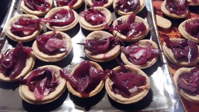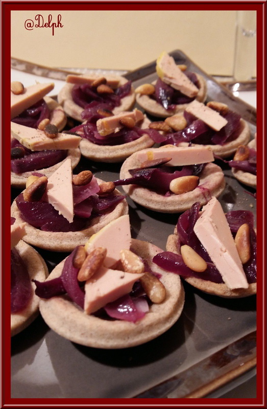 - Garnir les fonds de tarte avec les oignons confits, poivrer, déposer les copeaux de foie gras par-dessus et terminer en parsemant de pignons de pin.