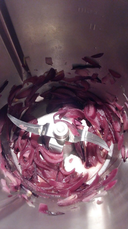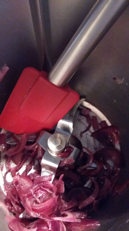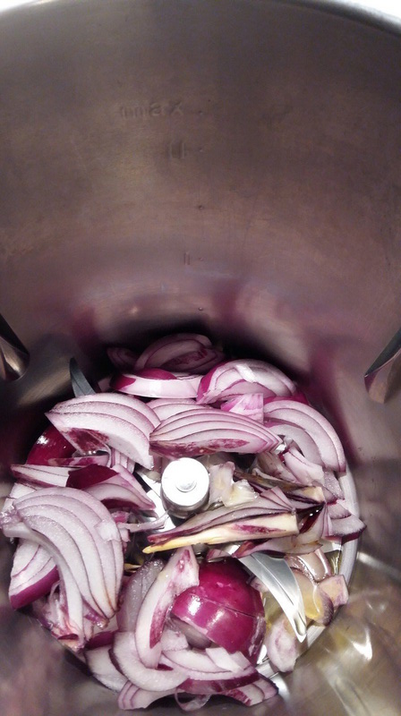 - Couper l’oignon en deux et ôter la partie blanche centrale puis tailler en fines lamelles, et le mettre dans le bol avec l’huile puis faire chauffer 5 min/100°C/couteau inversé/Vit mijotage sans le gobelet.
