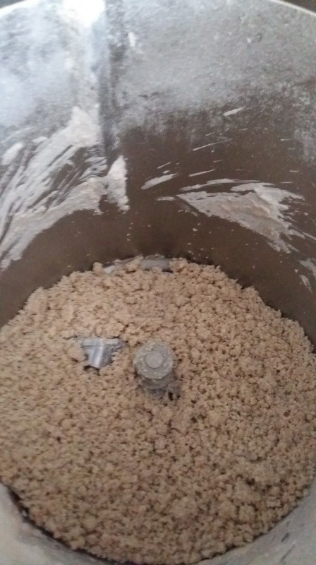 - Mettre les farines avec le beurre demi-sel coupé en morceau, le sucre et l’eau, puis mixer 20sec/Vit4. Former une boule, l’envelopper dans du film alimentaire et réserver au frais au moins 2 h.