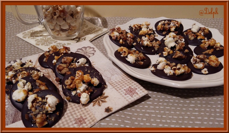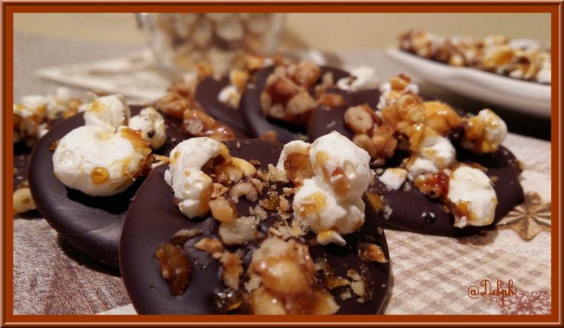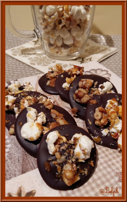 J’adore les mendiants avec du chocolat bien noir comme ça ! l’ajout des pop corn est amusant et bien sympa ! merci ma delphine belle idée gros bisous