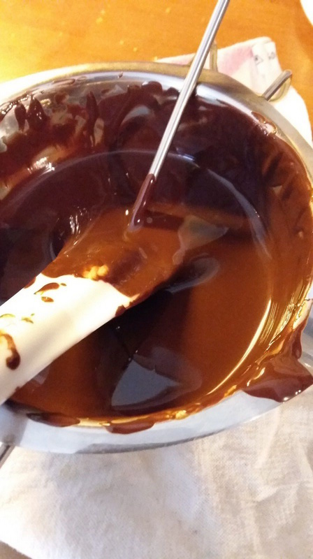 - Dès que la fonte du chocolat est bien avancée mais qu’il reste encore quelques pistoles entières retirer le récipient du bain-marie. À ce moment là le chocolat est à 40°C environ. Ne jamais aller au delà de 45°C.
