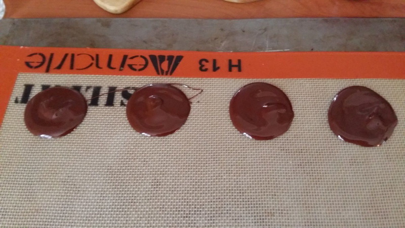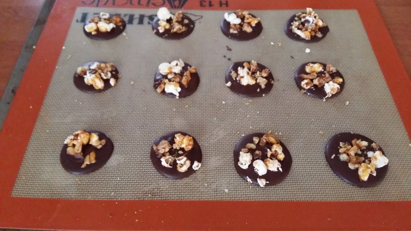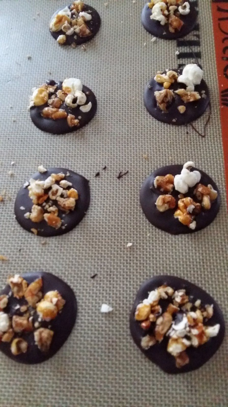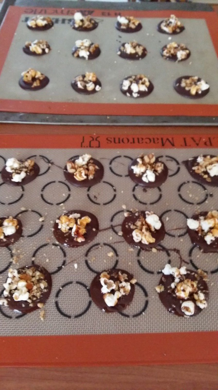 - Mettre un peu de chocolat sur la toile Silpat, puis avec une spatule, appuyer légèrement et donner une forme de cercle, faire 4 empreintes à la fois, répartir de popcorn et de pignons caramélisé. Recommencer l’opération jusqu-à la fin du chocolat.
