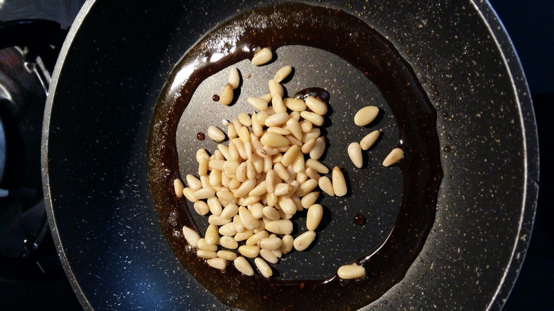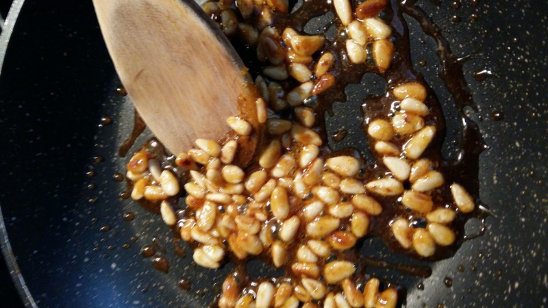 - Dans une poêle en céramique, faire fondre du sucre environ 2 c à soupe et le laisser caraméliser. Ne pas toucher, et laisser fondre, j’ai mis en position 5 sur ma plaque à induction, et j’ai attendu quelques minutes, ajouter les pignons, éteindre le feu et mélanger pour les enrober de caramel. Mettre à plat sur une toile Silpat, cela sera plus facile à couper. Réserver.