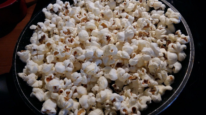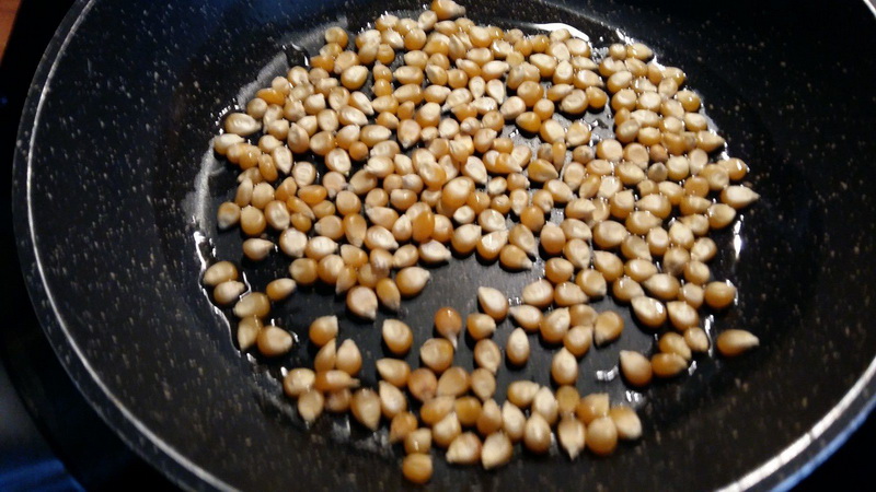 - Dans une autre poêle, mettre un peu d’huile et faire sauter le maïs en popcorn, j’ai mis sur position 6 de ma plaque à induction, mettre un couvercle et attendre que cela commence à « péter », puis soulever la poêle et remuer, remettre sur le feu, jusqu’à ce que cela soit fini, c’est très rapide. Mettre dans un saladier.