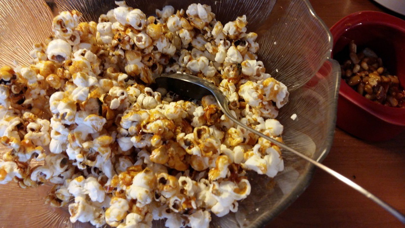 - Rincer la casserole et faire fondre un peu de sucre, environ 2 c à soupe.. Lorsqu’il a caramélisé, ajouter le popcorn et éteindre le feu. Mélanger pour les enrober de caramel. Réserver.