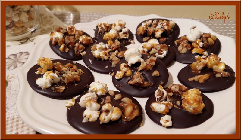 J’adore les mendiants avec du chocolat bien noir comme ça ! l’ajout des pop corn est amusant et bien sympa ! merci ma delphine belle idée gros bisous