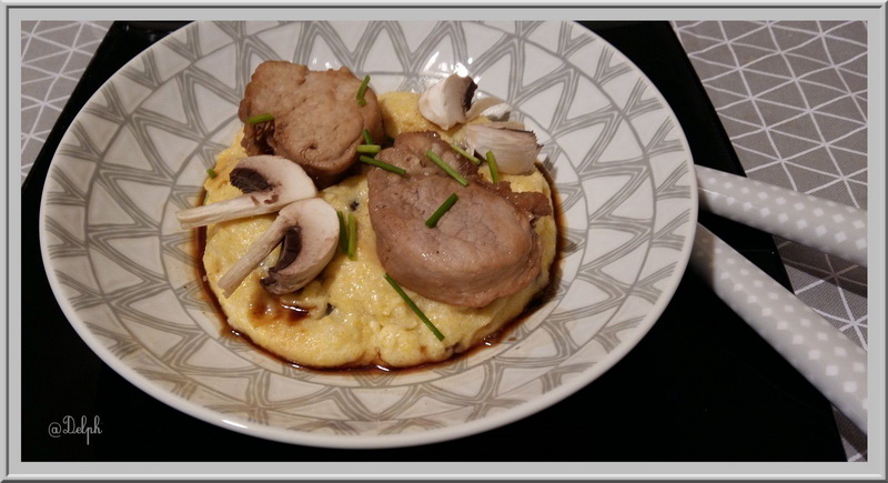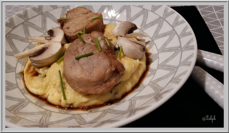 Filet mignon de porc laqué au miel et soja, polenta crémeuse aux champignons