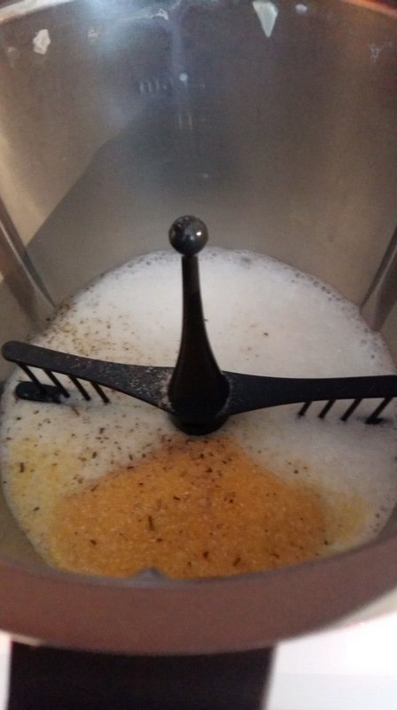 4. Mettre dans le bol  le lait, saler et poivrer puis programmer 10 mn/100°/vit 3. A la sonnerie,  Insérer le fouet, verser la polenta et continuer la cuisson  pendant 5 mn/100°C/ vit 3.