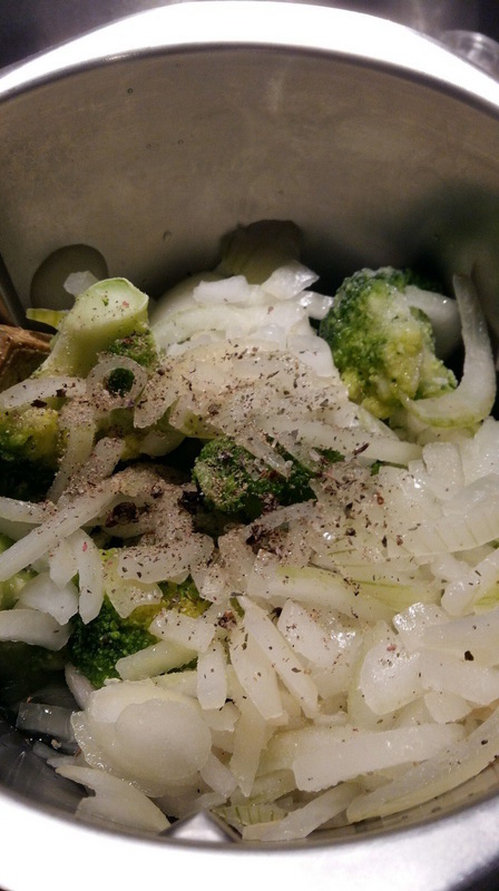 - Éplucher vos oignons et les couper en deux, mettre le brocolis et les oignons dans le bol du Thermomix avec l’eau, le bouillon cube, assaisonner, puis faire chauffer 20min/Varoma/mijotage.