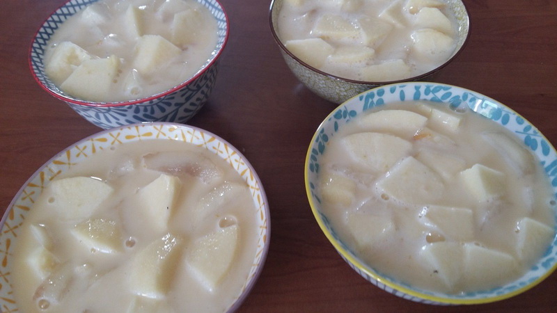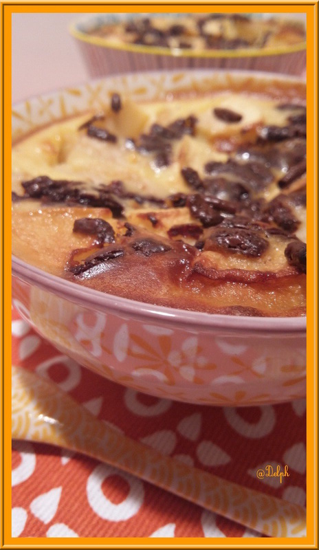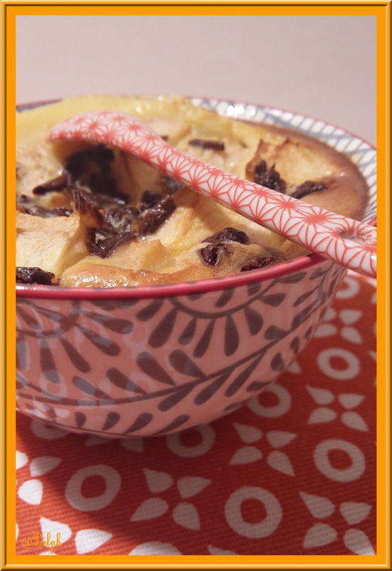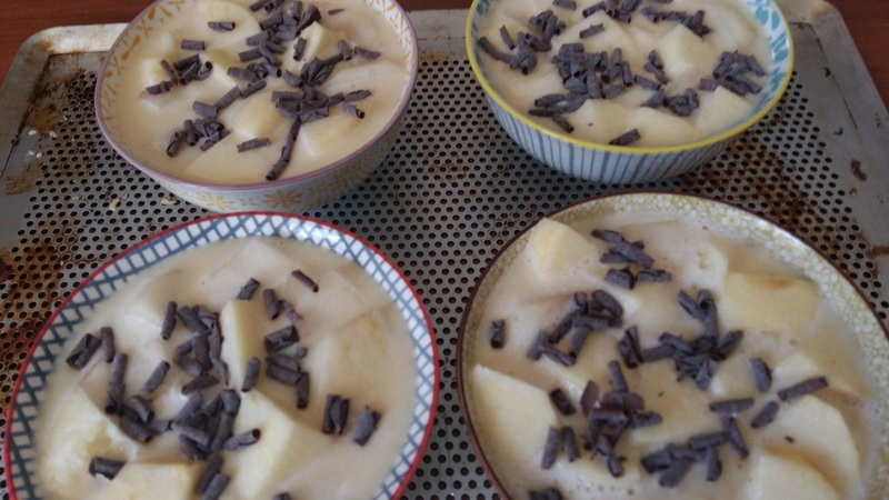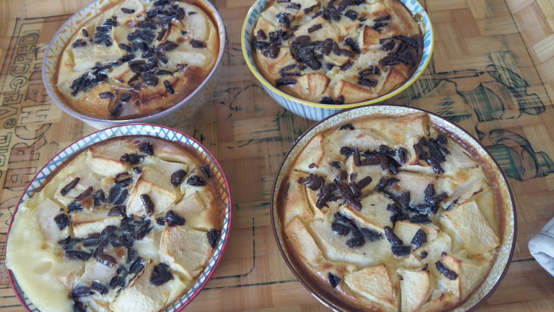 - Répartir la pomme, et les poires dans 4 petits moules à gratin et verser l’appareil à clafoutis.
