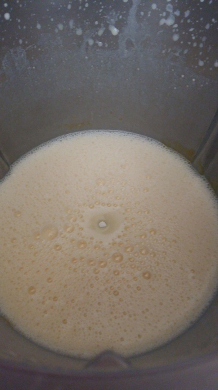 - Ajouter la farine, la crème, le lait, parfumer en râpant un peu de fève Tonka, ne pas la mettre entièrement le goût risque d’être trop prononcé puis mélanger 40sec/Vit4.