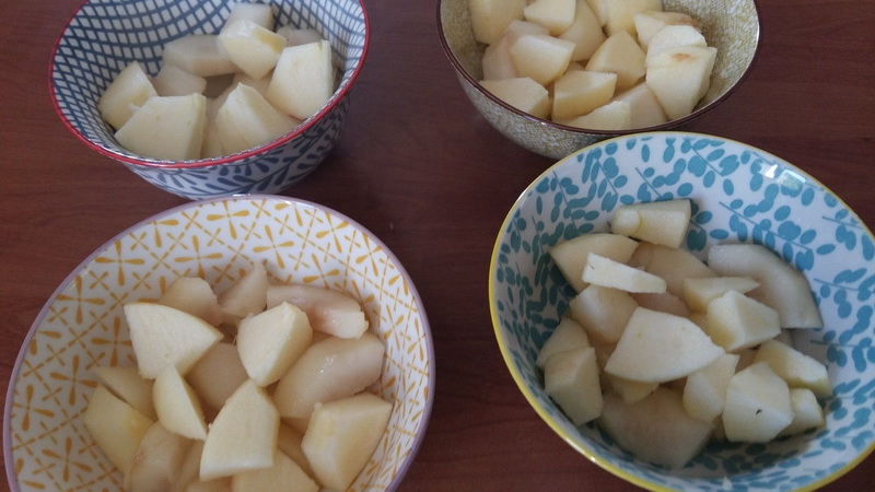 - Éplucher et détailler la pomme et les poires en petits cubes.