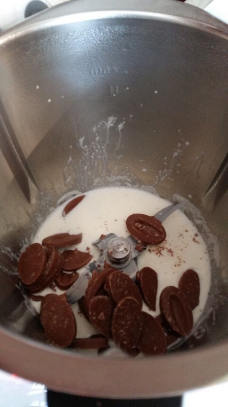 - Mettre la crème liquide dans le bol et faire chauffer 2min/100°C/vit mijotage, ajouter le chocolat Caramélia puis mixer 40sec/Vit 4.