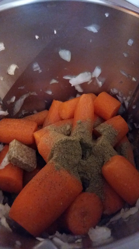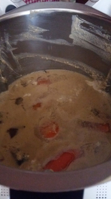 - Eplucher les carottes, les laver et les couper en grosses rondelles, les ajouter dans le bol avec l’eau et la crème de coco, le cumin, le bouillon cube, saler et poivrer puis programmer 20min/Varoma/Vit mijotage.